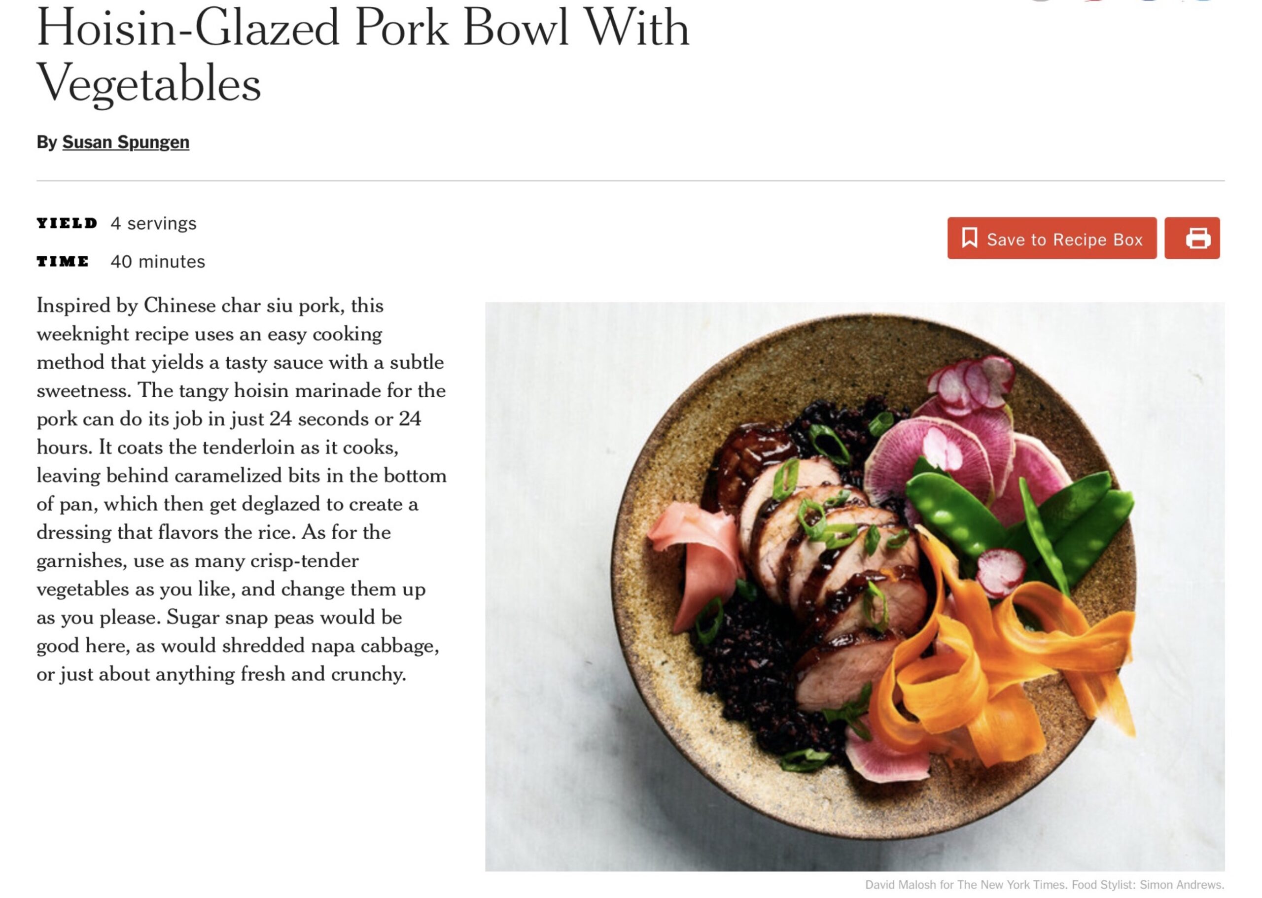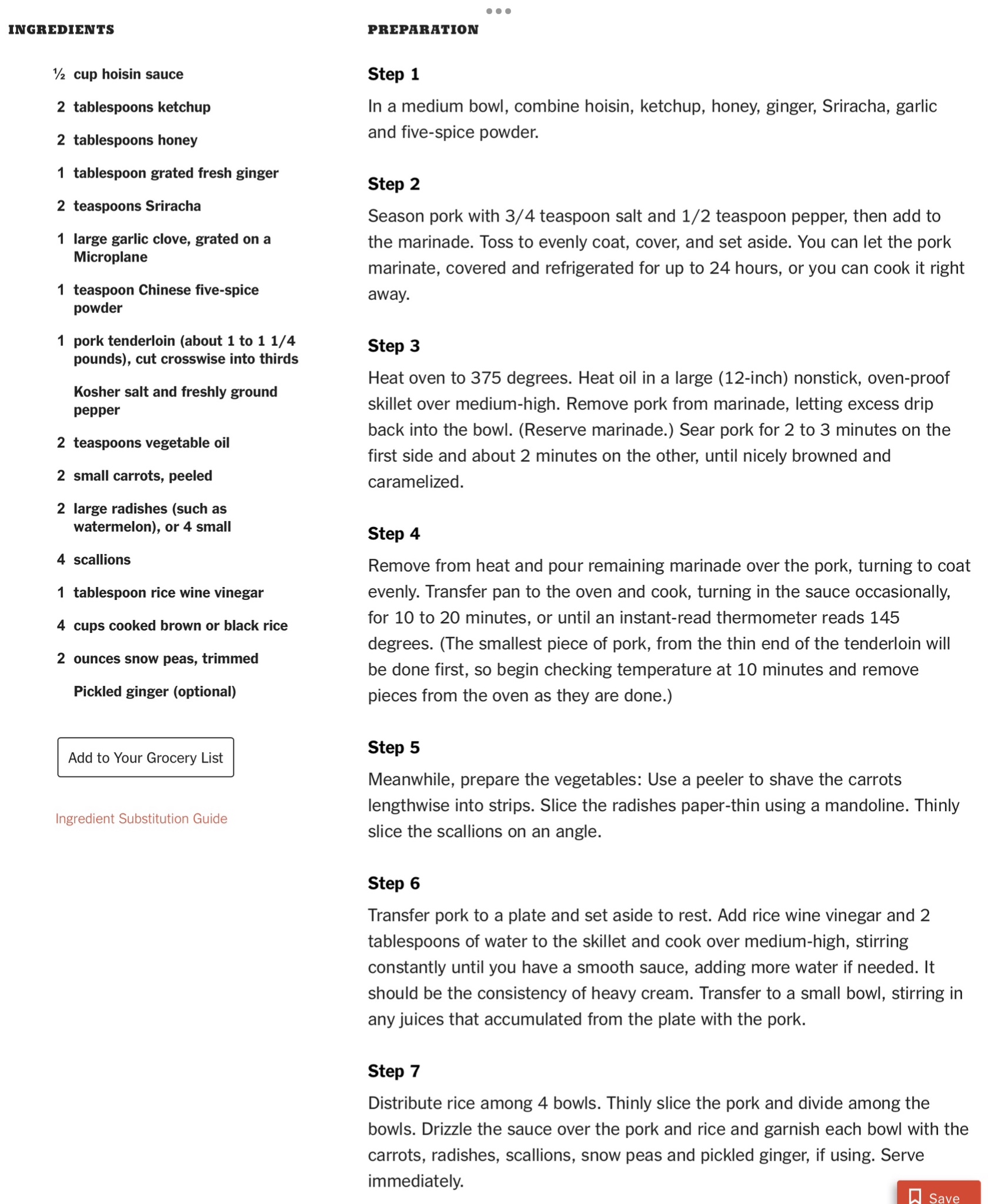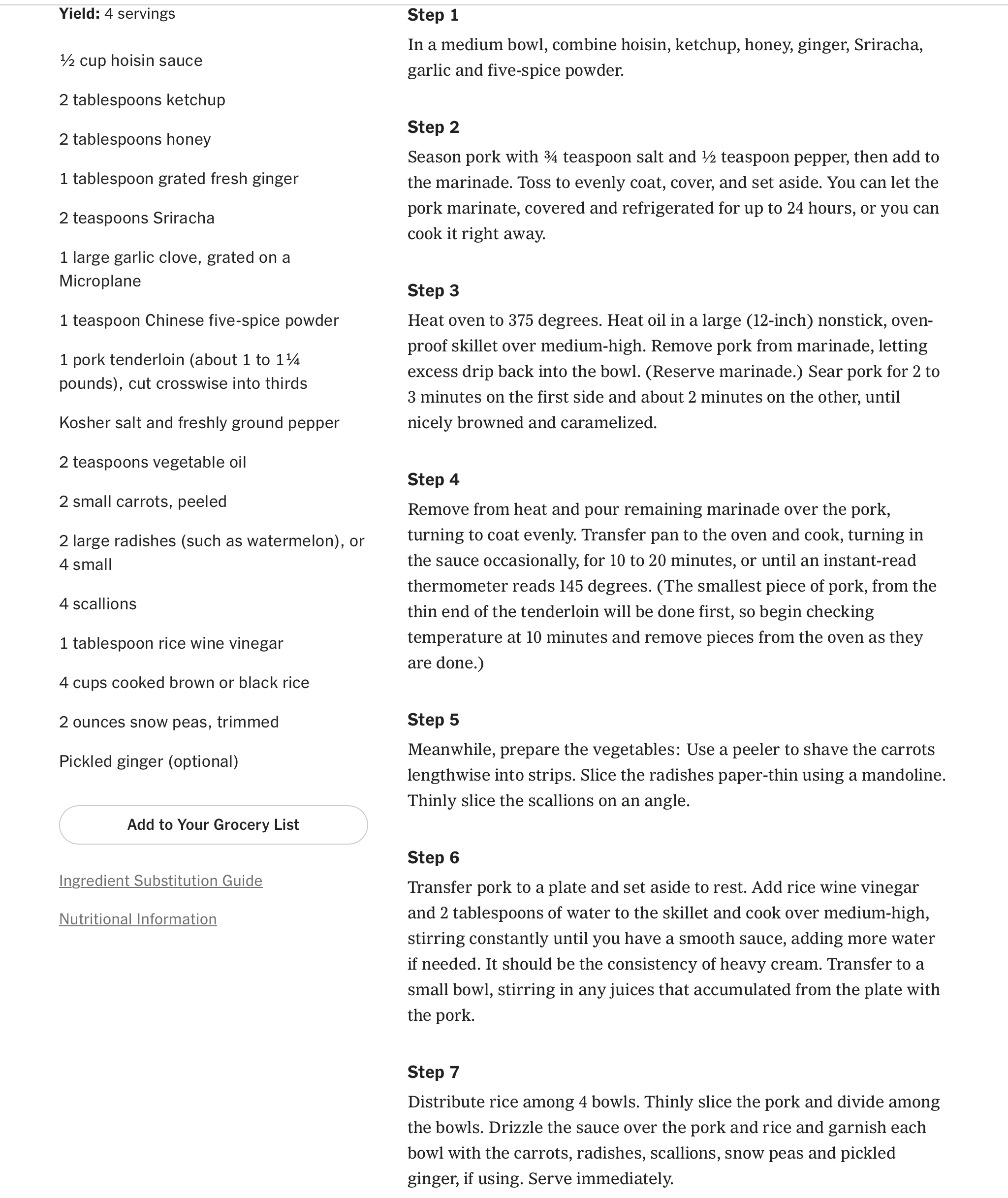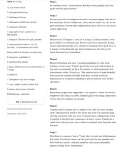 Heat 2 Tbsp oil to med high in a skillet. When oil is hot reduce heat to medium (so that sugar does not burn) add pork to pan and cook to well browned on all sides about 8 – 12 minutes. Transfer pork to a rack over a baking sheet covered in foil.